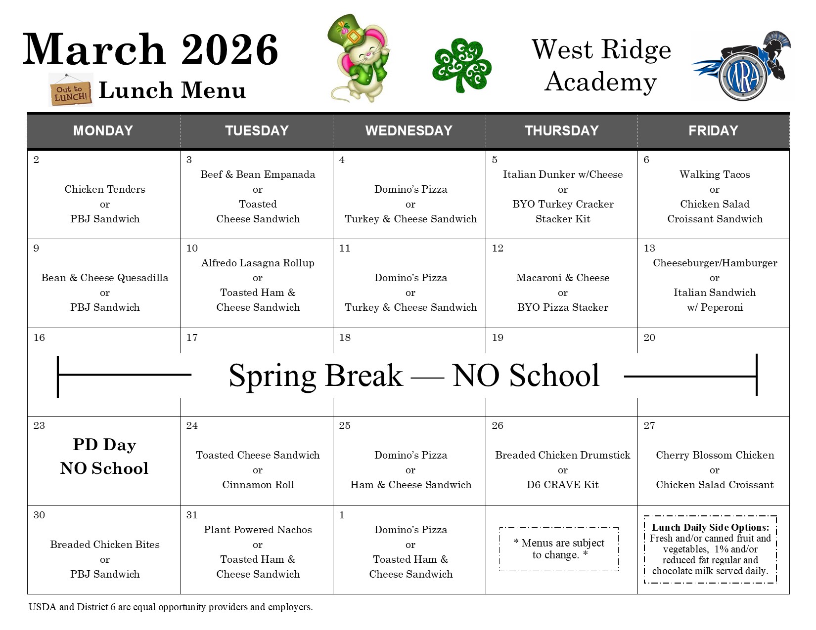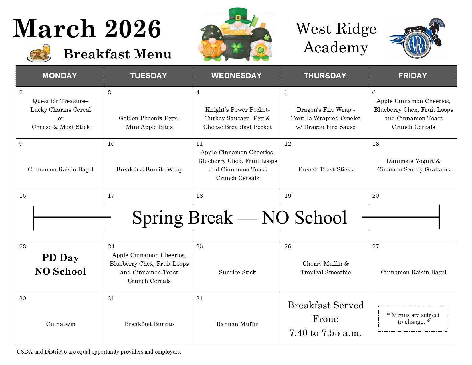 West Ridge works with District 6 Nutritional Services to provide breakfast and lunch. Everyday there is a hot and cold lunch entrée provided for students to choose from. There is a certain amount of both the hot and cold entrees. Not all students will get their first choice of the two options, but all students will receive an entrée for breakfast and lunch. WRA’s kitchen manager does the best she can to give students their first choice when it comes to entrees. During the first few weeks of school, it is a bit harder to predict how many children will eat lunch and which entrees the students will like best. As the year progresses, the kitchen manager will continue to adjust, the number of entrees prepared to accommodate students as best as possible.